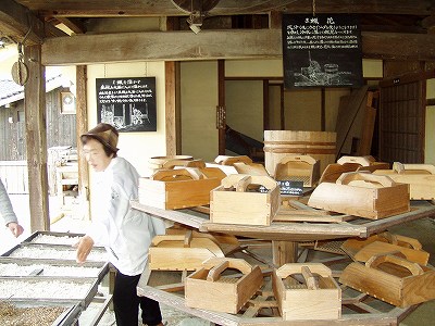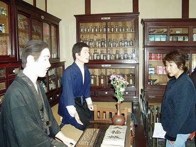 | ここは、「商いと暮らし博物館」です。 明治からの薬商「佐野薬局」を町が買い取り博物館としています。 当時のロウ作りで工夫されていた技術や、 働く人々の厳しい労働の様子を伝えるために作られているそうです。 唐辛子以外は、全員ロウ人形です。使用人は食事をする場所や内容までずいぶん違います。 |