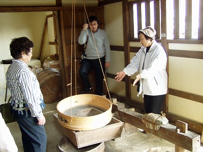 ここは奈落です。ガイドさんがしがみついているように 見えるのは、回り舞台を回すために使うものです。 せり上がりの装置も人力式です。 |
