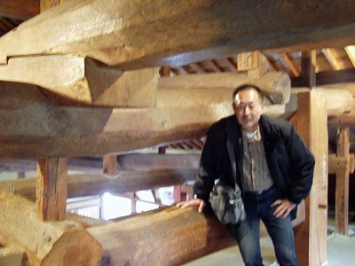 | 建物の母屋に入ると、その財力の豊かさが分かります。屋根裏にはり巡る柱や梁を見てください。 | ||