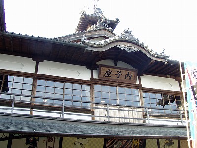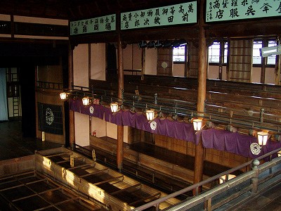 内子散策も北から南へ歩いてきて、最後にたどり着いたのが「内子座」です。この木造劇場は、大正12年に大正天皇の即位を祝って建てられたそうです。 歌舞伎や文楽、時には映画や寄席などが演じられ、賑わった そうですが、老朽化により取り壊しとなるところを、町民の皆さん の熱意によって、昭和60年劇場として再出発したそうです。 劇団民芸の宇野重吉はここがお気に入りだったそうです。 |