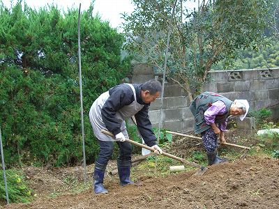 次は葱を植える畑に桑で溝を掘ります。