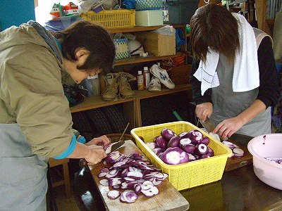 そのころ、トマトさんと唐辛子は、洗い終わった赤蕪の汚れた部分を切り落とす作業に入っていました。 |