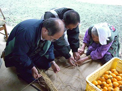 縄作り職人と、柿をぶら下げる担当と、撮影隊。