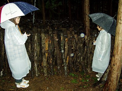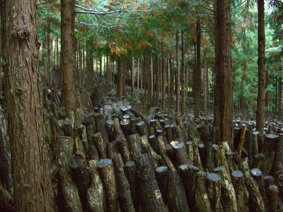 午後から本格的に降り出した雨のために、農作業は出来なくなり、菊池さんが原木椎茸を作っている山を見学しました。これ奥の方までびっしりクヌギやコナラの原木が並んでいます。すべての木に菌が埋め込められています。 |