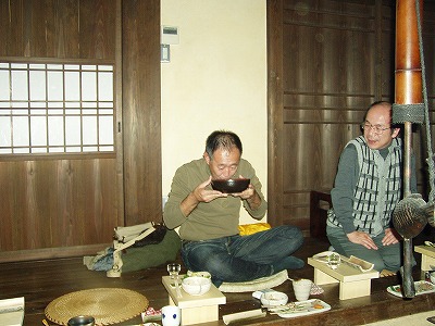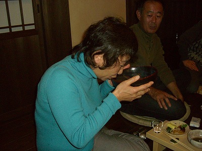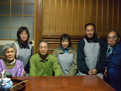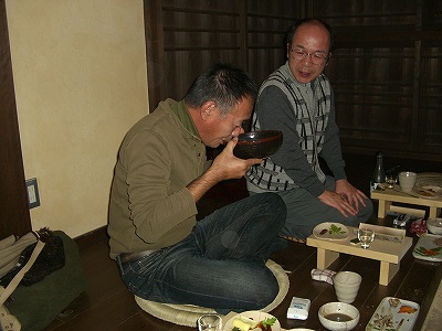 初めて紹介しますが、ワイシャツ姿の方が、ふるさとの宿の支配人兼この別棟である才谷屋の支配人でもある田中さんです。とても温厚な雰囲気で料理の紹介や手配など、きめ細かい気配りをしていただきました。 |