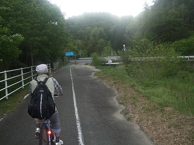 坂の勾配はきついのですが、その分距離が短い 予想以上に早く峠を越えることが出来、下り坂に なりました。山の向こうに橋の橋脚が見えています。 |