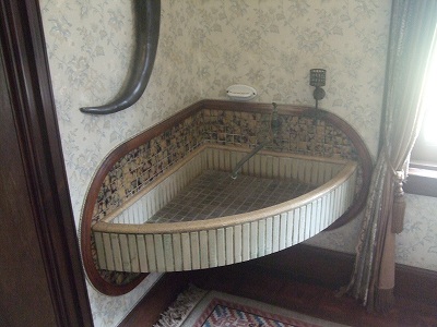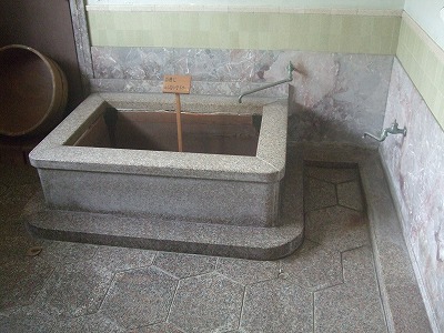 お風呂ですね。 冬は相当冷たそう。 湯船の中は木で出来ていました。 |