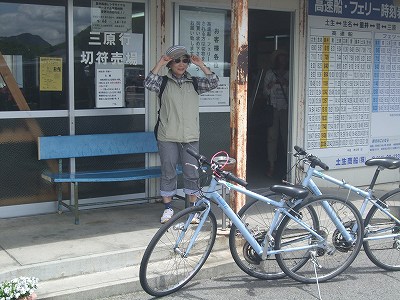 重井西港までやって来ました。あと1km。出航まで10分 しかし、その1kmが急な坂道だったのです。 あきらめ他のルートを考えることにしました。 この港から、佐木島経由で三原港へ行く高速船が あることを唐辛子が係のおばさんから 教えてもらいました。やった!これで間にあうぞ。 重井西港で自転車も返却することが出来ます。 |