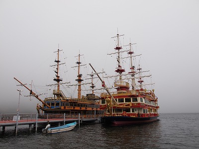 確かに芦ノ湖は深い霧の中 海賊船が出ないとなると、その先のケーブルカー 大涌谷など先に進めません。 |