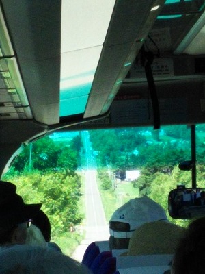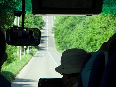 | では、最終日の今日は裏摩周湖からです。 バスのフロントガラスから見える一直線の道路は全長約18kmの直線道路「天に続く道」として有名です。 右の写真は鹿牧場(なんと食用の鹿ちゃんです) |