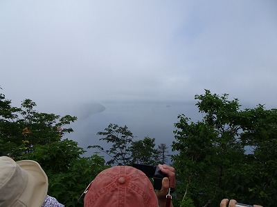 ここは、裏側 表も裏も霧でほとんど見えません。 たまに、霧が薄れて湖面が姿を現しました。 |