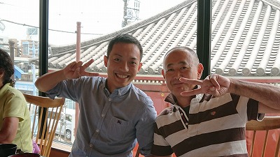 お店の前で記念撮影 トンちゃんは、道路の反対側へお散歩中 |