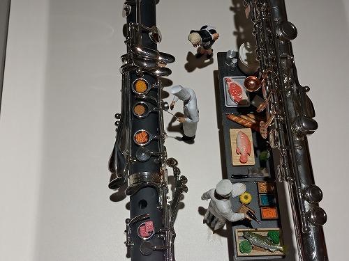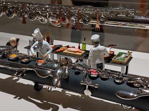作品にはユニークな名前が付けられています。 「楽器で奏でる食のハーモニー」 フルートの上で料理を作っています。 |