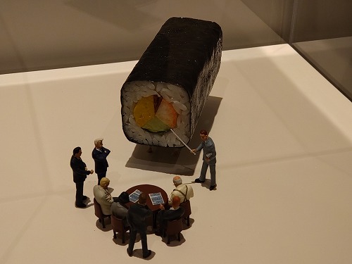作品には写真撮影した物と本物が並んで展示されています。 「会議は巻きでお願いします」 |