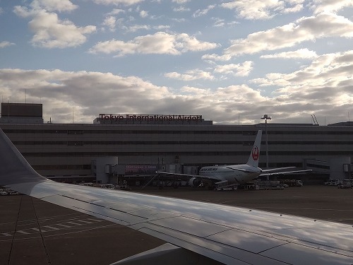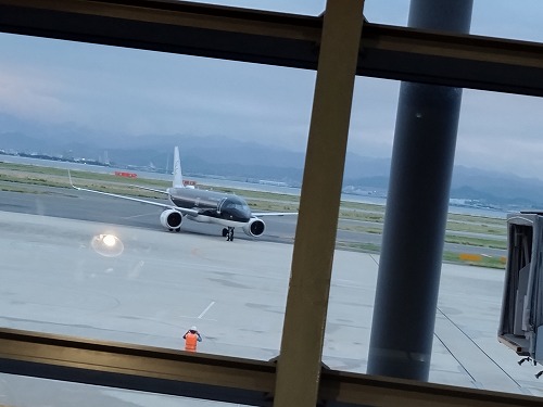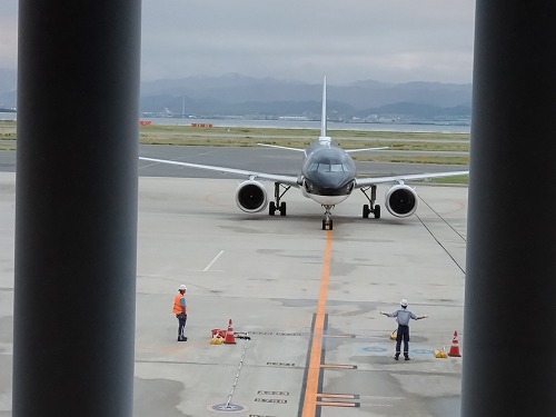 新しい搭乗手続きのシステムにアタフタしながらも出発ロビー 私たちが搭乗する飛行機がやって来ました。 |