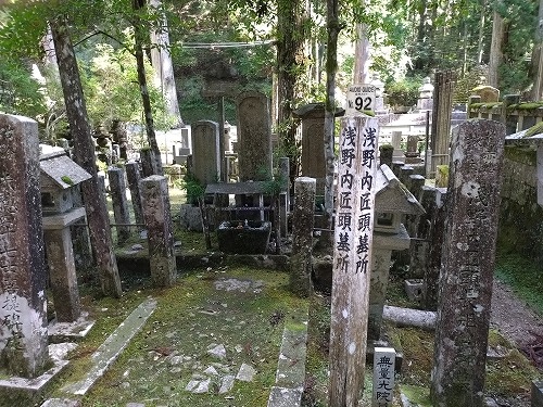 | 左の墓は明智光秀のものですが、分かりにくいですが石が二つに割れています。 何度か修復してもまた割れると言われています。近くに織田信長の墓があるんです。 とお坊さんが説明してくれました。 |