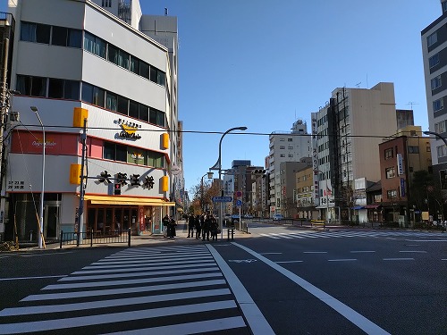 見返り柳のある土手通、すぐ左には有名な「土手の伊勢屋」があります。 そして警視庁第6方面本部もあります。 |