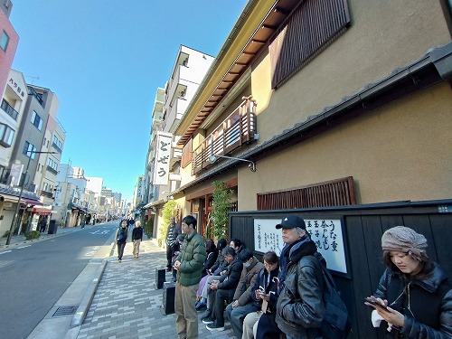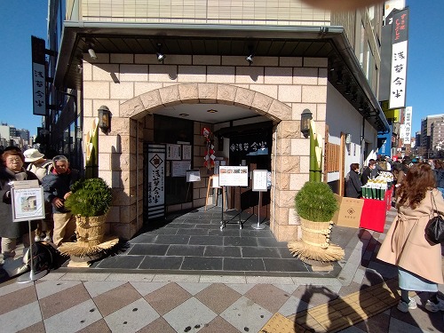 行列して開店を待っている店は「どぜうの飯田」と「浅草今半」すきやきです。 |