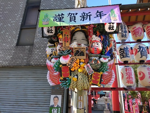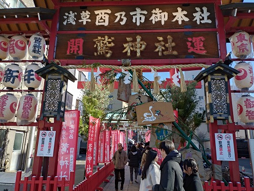 30分以上歩いて、やっと鷲神社に着きました。 鳥居の周りは超華やかです! |