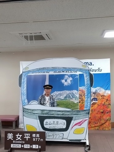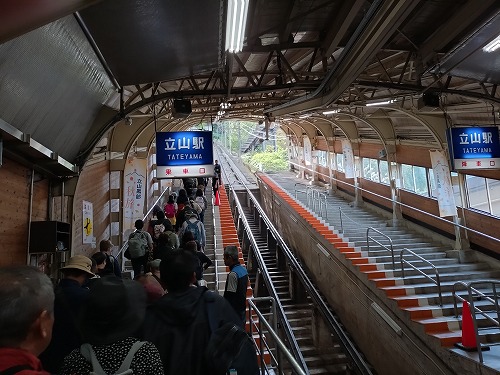 美女平駅に到着 標高は977m ここから室堂まで立山高原バスで一気に登ります。 この高原バスは5月ごろ道路が開通すると雪の大谷を通り向けることで有名です。 |