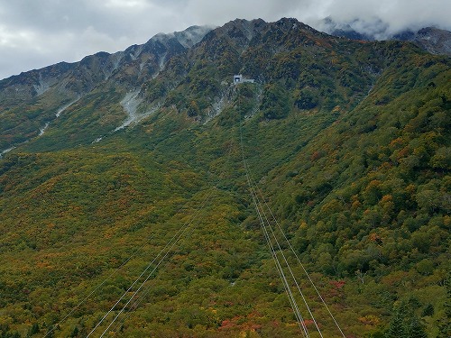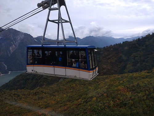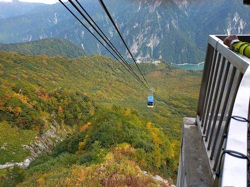 ロープウェイが黒部平駅から上がってきました このロープウェイ、途中に支柱は一本もありません。 |