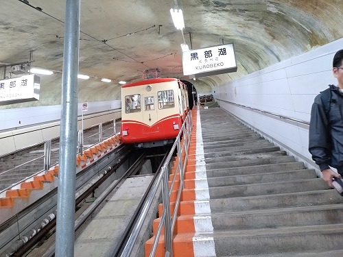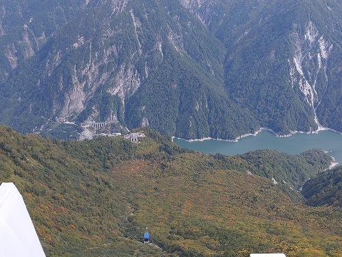 黒部平からケーブルカーで黒部湖駅まで下りてきました。標高差は約400mです。 |