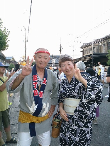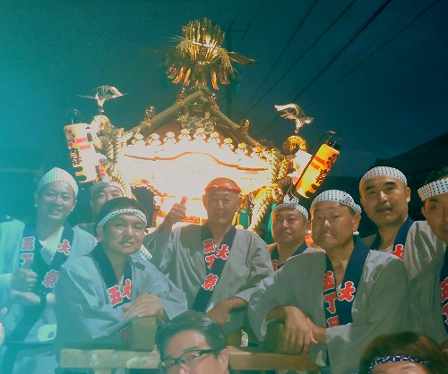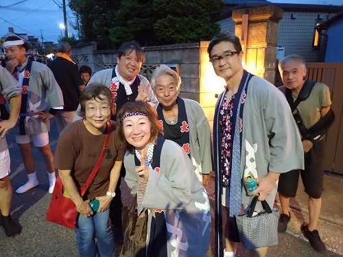 担ぎ手の集合場所です。 例大祭で知合った方も多くいます 右の写真は五丁目の仲間。 |