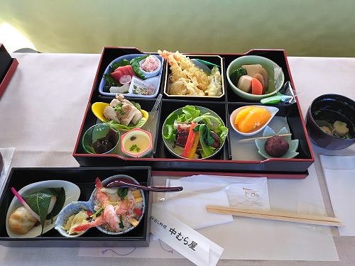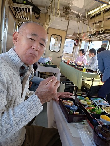 | 列車の車内にテーブルを備え付けた即席の食卓 そこで、地元の食材を使った懐石料理 (仕出し料理 中村屋) |