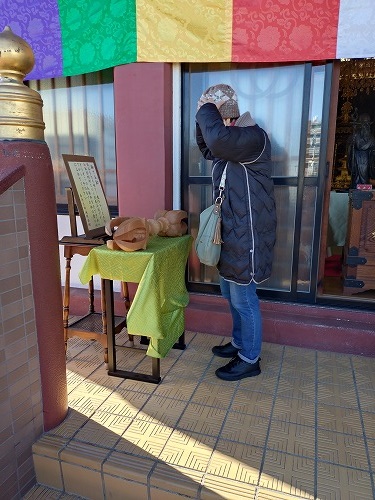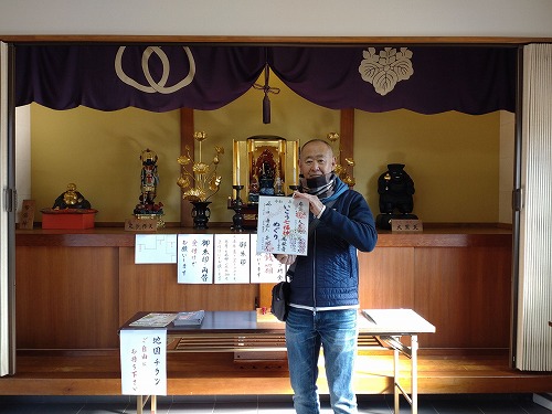 色紙を購入して左のテーブルで自らスタンプをギューって押しました! 伊興七福神はすべてがスタンプ! 右が布袋さま |