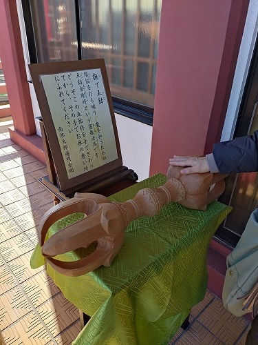 | 撫で五ご 五ご金剛杵という道具です。 これを撫でて体の弱い場所を触ると良くなるそうです。 |